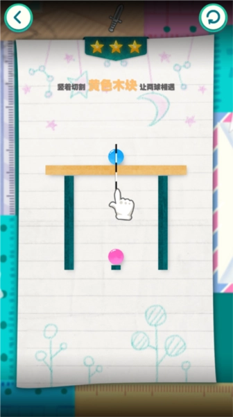 4、切割木条、绳子等障碍,为两个球创造自由滚动的条件,让它们甜蜜撞击即可进入下一关。玩家需寻找巧妙的闯关方法,将所有球球充分分开,玩法充满乐趣,令人感觉无比上瘾刺激。