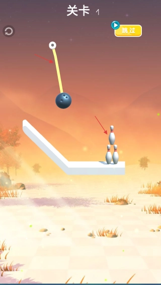 1、基础割绳玩法:点击屏幕切断绳索,借助重力使保龄球下落击倒目标,达成指定任务即可通关。