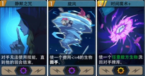 在法术运用上,静默之咒可以填补主动技能无法封锁对手技能的不足,搭配旋风、时间魔术这类带有回手效果的卡牌,把场面上的生物全部清理干净后,就能真正实现让对手毫无作为的局面。