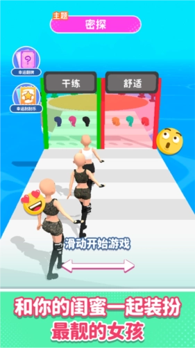 3、你可以通过左右滑动屏幕来操控角色的移动方向,并且要依据不同的主题来为角色搭配合适的衣服。