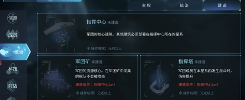 统治功能可查看已占领的星系,建造功能则用于完善军团建筑,包括指挥中心、军团矿、指挥塔、晶体回收站、跃迁辅助装置、护盾发生器和空间稳定器。