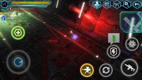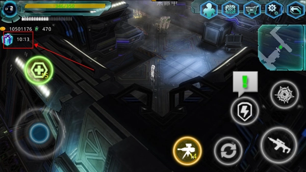 这款游戏的操作难度不高,进入游戏后,玩家能看到界面左下角有个圆环按钮,它是用来控制角色移动的——玩家只需按住该按钮并朝目标方向滑动,就能让角色向对应方向移动。移动过程中,玩家需留意地面上绿色箭头的指引;若遭遇异形生物,点击界面右下角带枪图标的按钮即可发射子弹攻击目标。此外,游戏中还提供了一个带有黄色图标的机枪标志道具,点击该图标就能释放机枪塔进行自动攻击。