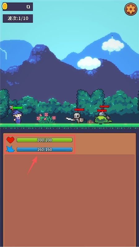2、进入游戏后,界面左上角会显示当前的金币数量与波次信息,角色的血量和蓝条则位于画面下方。要记得通过战斗击败怪物,以此来获取金币并推进波次进度。