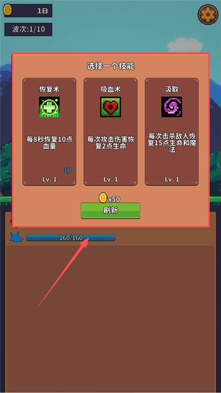 3、闯关时会弹出技能选择界面,你可以从恢复术、吸血术等技能中挑选一个来强化角色能力。