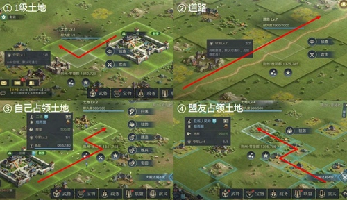 地图初始阶段就散布着大量1级土地,主公们可先观察其分布情况,利用这些能直接通行的地格规划行军路线,避开高级土地的阻碍,从而快速完成土地占领,减少不必要的铺路时间。