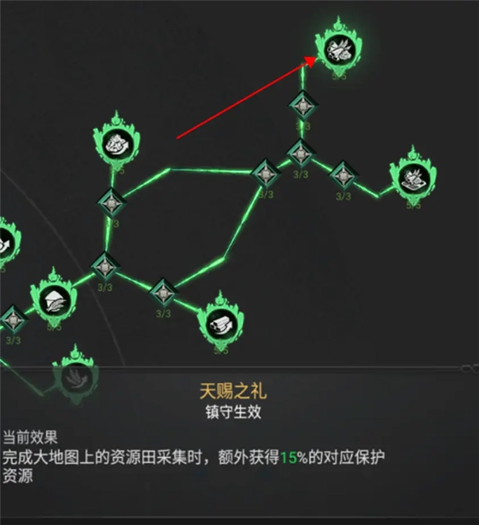 ③星辰巨龙:当你把天赋点数投入到技能“丰收时刻”后,在采集结束时能额外获得15%的基础保护资源(该效果不分地区,且为满级状态下的加成)