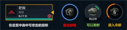 2、舰载武器指的是安装在船只上的武器。在总览界面选中一个可攻击的目标后,点击武器按钮,如果目标处于该武器的射程范围内,武器就会发射,随后进入冷却状态。