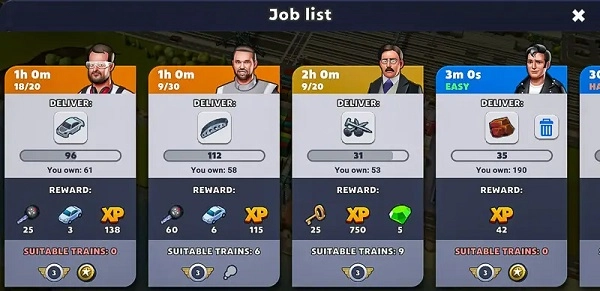 铁路大亨2会给玩家安排任务,这些任务也可以叫做“工作”。简单来说,玩家需要按照要求提供特定数量的某种商品。这类任务没有时间方面的限制,不过部分任务对机车类型有要求。从上面的截图能看到,有些工作显示“没有合适的火车”,这表明当前没有符合要求的机车类型(史诗级)。