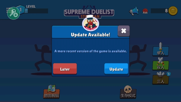 1、进入火柴人至高对决后,在此处选择“later”,暂时不进行更新,若有更新需求,请以本页面信息为准;