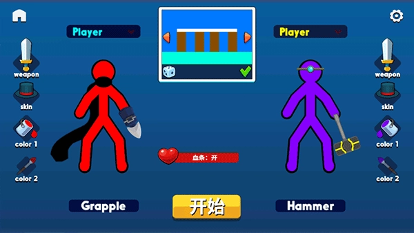 3、小编以双人模式为例,上方能够挑选地图,左右两侧可以调整火柴人的形象。