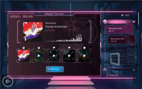 左侧为抽卡系统,需付费解锁,左下角如图1所示,每个曲包包含三首曲子,曲子右下角的图标用于解锁该曲子所属的人物曲包,具体对应关系可参考图2中人物曲包的背景标识与曲子的匹配情况。