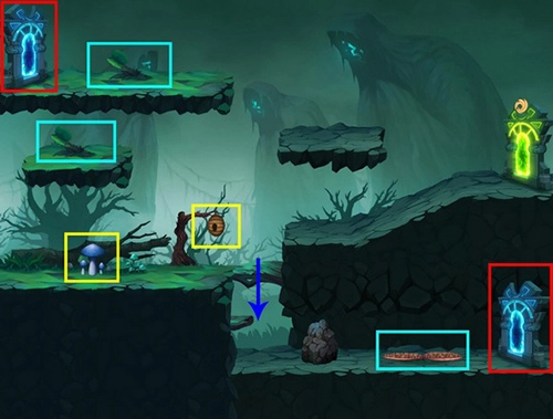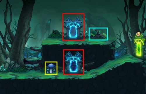 注意要点:左侧绿色框内有概率出现蓝色门,上方红色框或许不会出现蓝色门。下方存在有毒蘑菇与蜜蜂窝。