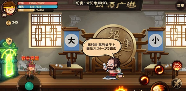 赌场:传送进赌场后,站在标有大或者小的桌子上。等待庄家摇色子,如果赢了可以获得5幻境币,输了会失去5幻境币