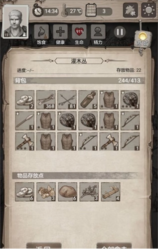 打完废墟后回家迁营,接着按顺序去打石堆(这是石块、石片、生肉的循环资源点)和灌木丛(这是浆果、草药、亚麻的循环资源点)。另外,进矿洞记得带上四把镐子。