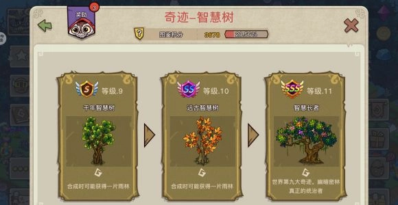 4、四级及以上的智慧树能够采集出树叶,使用合成七级及以上的智慧树有概率产出雨林,目标是刷出至少一个一级雨林。