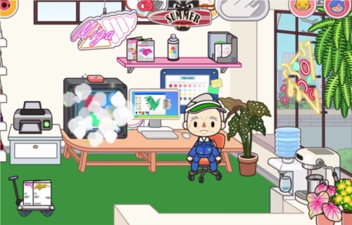 3、点击进入印刷厂,门口立着一个大型猫咪立牌,还有一位管理的叔叔正在操作打印机器。