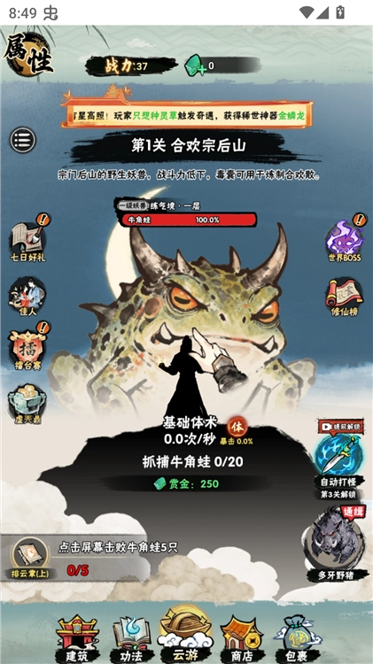 3、接着点击下方的“功法”选项,学习体术、剑法、符法、媚功等各类功法。