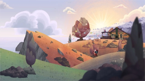 3、移动至椅子前:直接点击远处的房子,老人会自动寻路,跨越各个山谷,走到房子前的椅子旁坐下。点击房檐上的情侣,他们会进行一些互动,随后老人便开始回忆……回忆结束后即可进入下一关。