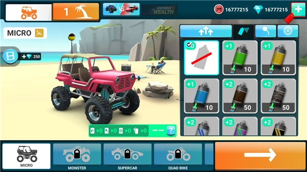 玩家还能解锁怪物卡车、两栖车、雪地车等十多种载具,每种载具的性能都截然不同。你可以通过升级引擎、加宽轮胎等方式,提升车辆的速度与抓地力,打造出专属于自己的竞速座驾。