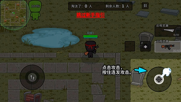 3、降落到地面后,通过拖动左侧摇杆来控制角色移动;上方小地图里的绿色圈是安全区,圈外则属于中毒区域。