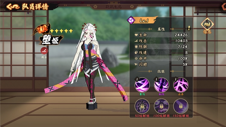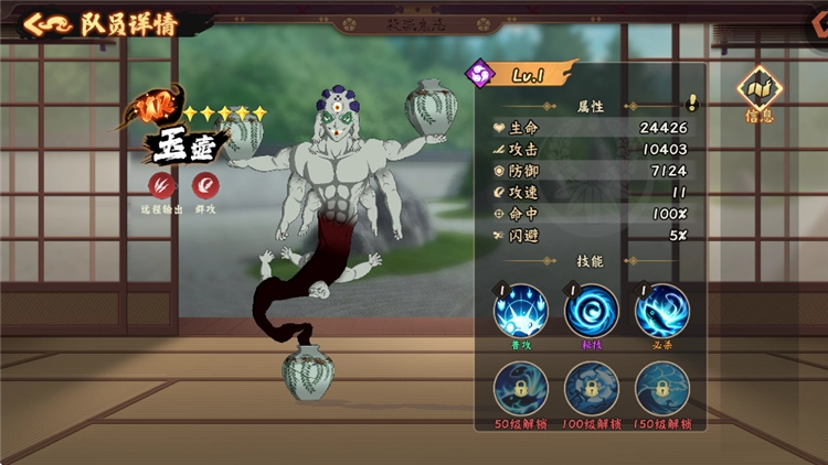必杀技:【拾之牙圆转旋牙】能为自身生成相当于攻击力140%的护盾,同时对自身周围圆形区域造成攻击力300%的伤害,随后对每个受击敌人有60%的概率施加[嘲讽]效果。