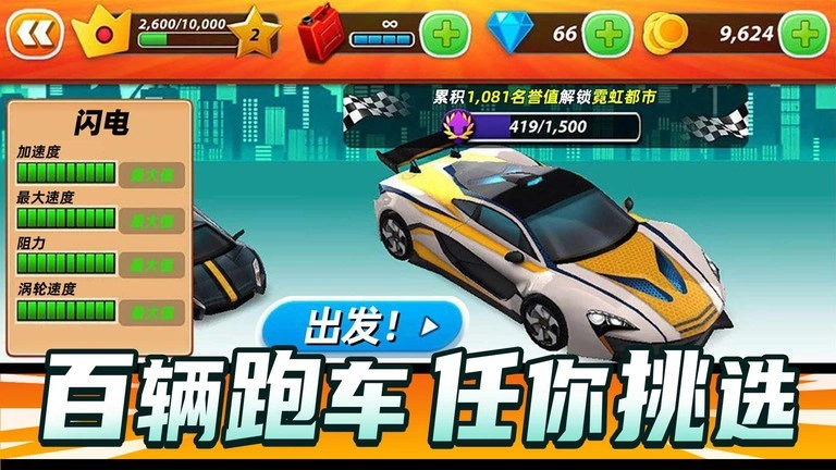 1、在狂飙飞车的世界里,只要你付出足够的努力,所有车辆都能解锁,快来打造专属于你的车库吧!