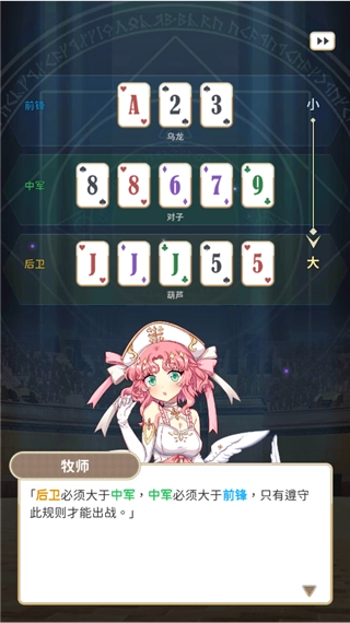 1、里面的规则具有优先级,出牌时要记住后卫的优先级高于中军,中军的优先级高于前锋。