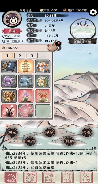 总结:这个玩法的核心思路就是快速积累财富,借助正道功法和宠物带来的高额金钱加成打通赚钱渠道,等功法和宠物培养到位后,直接购买修为就能迅速飞升!