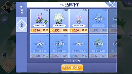 2、玩家进入花园后,第一步要购买鲜花种子。鲜花种子的价格大致相近,但需要玩家的种植等级达到特定要求,才能解锁并购买更高等级的鲜花。玩家可依据自己花园里已解锁的花盆数量来选购种子,只有拥有鲜花种子后,才能开展种植操作。