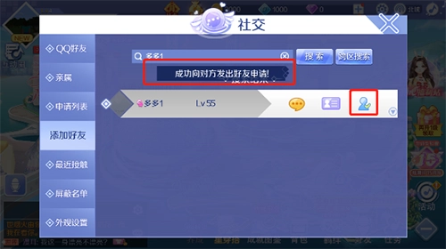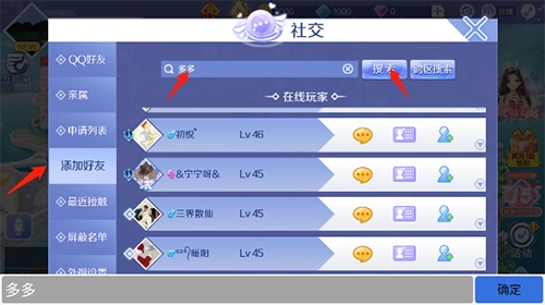 3、进入社交界面后,找到添加好友的选项并点击,接着在输入框中输入好友的名称,最后点击搜索按钮。