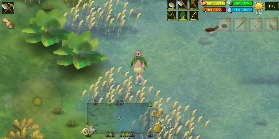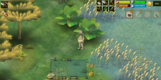 这里面有不少投掷类的工具,像石头、竹叉、弓箭都在其中。你偶尔会碰到一些猎物,例如草原上的兔子、池塘里的鱼。你得用投掷工具对准猎物来捕猎,当然啦,不同的猎物得搭配不同的投掷工具才行。
