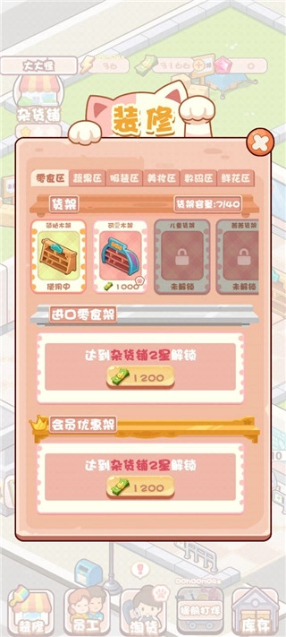 随着资金的不断积累,玩家能够对货架进行扩建,引入利润更高的商品,以此增强超市的竞争力,提升其盈利能力。