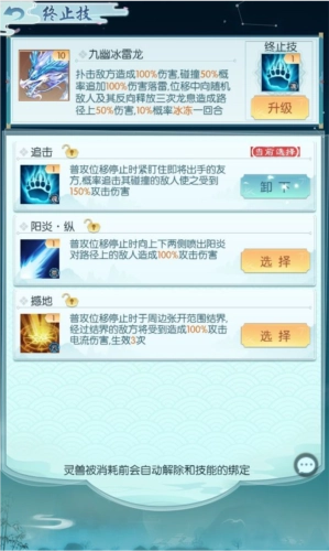灵兽的技能包含觉醒技与终止技两类,每只灵兽的觉醒技都独具特色,而终止技则能够由使用者自由组合搭配。