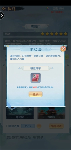 不同的境界可以进不同等级的门派。门派技能还可以兑换秘籍。但前期你氪金的情况下,五星以内的门派秘籍换不换其实都没有效果。所以前期门派功绩必须每天要把那瓶酒换到手上。化神进五星开始可以跳槽几个门派学习技能,然后宅到一个有秘籍的门派弄书,(注:微氪玩家需要前期就开始攒秘籍书,到了合体才开始存酒)