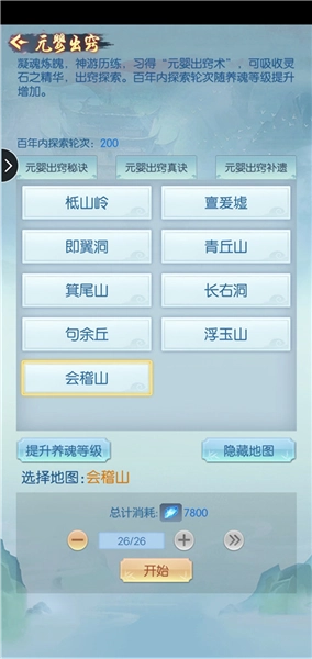 灵石目前唯一能稳定获取的地方是关卡神游。出窍状态下花费30000灵石就能进行神游,个人建议把100玉的神游次数也一并购买,这样能提升神游效率。前期通过神游获得的灵石相对较少,所以买书时优先选择4-5星的即可;等到后期需要购买6-7星书籍时,神游就成了主要的灵石来源。我自己测试过,在图15消耗7000灵石进行25次神游,大概能收回15000左右灵石,这样算下来两天就能攒够一本六星书的费用,刷更高级的地图效率还会更高。