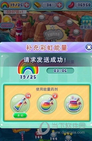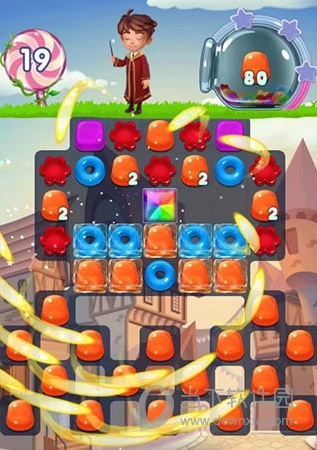 6、当4颗糖果连在一起时,会触发强力的魔法特效,启动该特效后,能消除直线上的所有糖果。