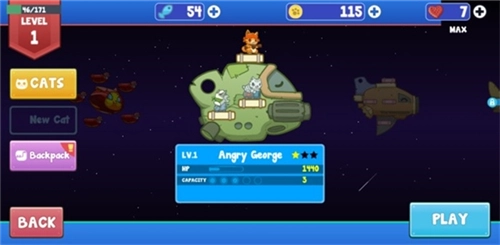 《决战喵星》是一款超有趣的猫咪飞行射击闯关游戏。在游戏里,你将化身成超级可爱的小猫咪参与战斗,游戏模式有点像塔防,需要把猫咪拖到飞船上发起攻击。游戏提供了不同种类的猫咪,每种猫咪都有专属技能,有的能帮助回血,有的可以维修飞船等。猫咪的种类十分丰富,连飞船也都能升级,感兴趣的玩家快来体验吧!