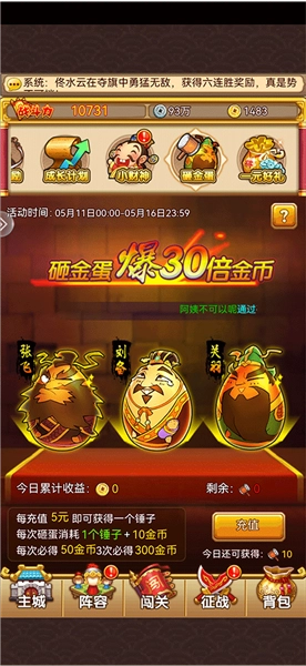 4、砸金蛋活动算是充值最划算的时机,要是想充点钱玩,就趁砸金蛋的时候充,建议一天充30块钱就够了,因为没有50的充值选项。