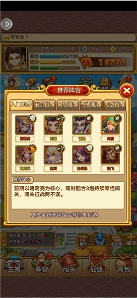 前期以诸葛亮为核心,搭配3门火炮持续眩晕怪物,闯关和征战可以同时进行。