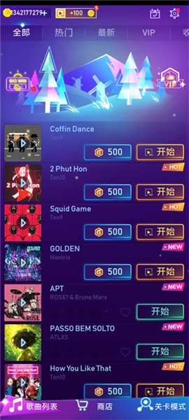 打开后,在歌曲列表界面能自由挑选各类热门歌曲或其他曲目,点击“开始”按钮就能进入节奏挑战环节。