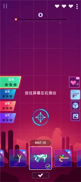 进入游戏后,玩家可以根据自己的喜好选择简单、普通、困难或者无尽模式等不同难度,还能够切换多种炫酷的枪械,只需要按住屏幕并且左右滑动就可以轻松进行操作。