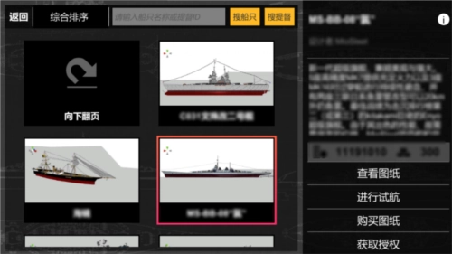 点击“购买设计图纸”按钮,即可进入的图纸交易大厅,在这里可以直接购买其他提督的优秀设计。同时,您也能查看其他提督的优秀图纸,并模仿其结构来强化自己的设计。