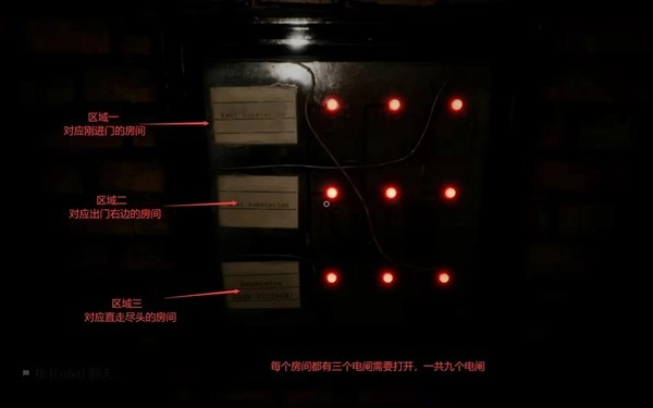 ①在三个区域内开启9个电闸,电闸的位置是随机刷新的,不过死亡不会导致其重置。