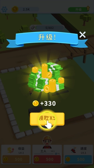 2、每位工人可获得500金币的收益,点击升级即可领取对应的金币大礼包。