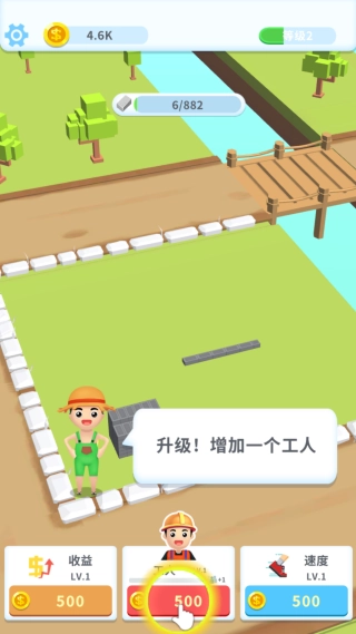 1、刚开始我们需要做的就是购买一个工人来准备搬砖,花费500金币就能增加一个工人。