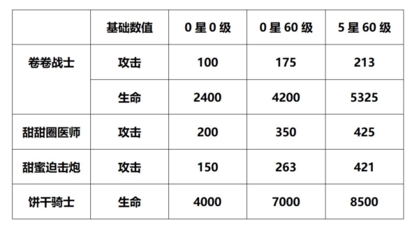我做了一个表格,方便大家横向对比:同样是满攻击潜能的甜甜圈医师和甜蜜迫击炮,还有以血量优势著称的饼干骑士。