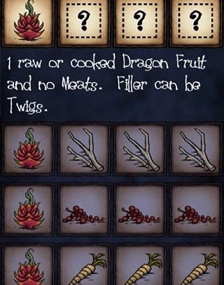1个火龙果搭配3份填充物,填充物可以用树枝但不能是肉类,这是一份相当不错的食谱,搭配方式灵活自由,保质期也比较长,属性数值较高。