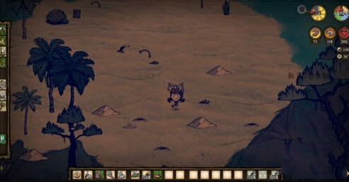 1、先给大家科普一下饥荒里的螃蟹。除了特定版本外,其他版本的饥荒是没有螃蟹这种生物的。螃蟹仅会出现在沙滩区域,也就是初始出生时那种淡黄色的地形上。