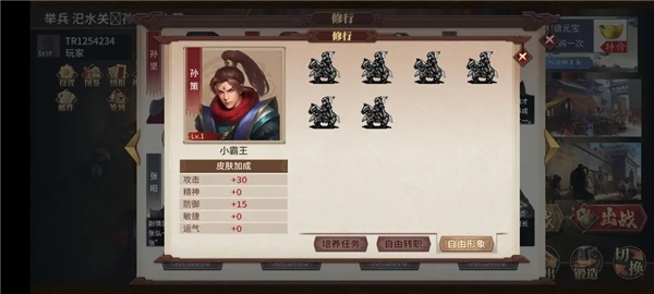 2.吕布——孙坚达到7级时会自动加入队伍。8个1级皮肤总共花费1600元宝可合成4级皮肤,其优点之一是皮肤特技“无极”能让角色攻击一次(杀人后可再次行动)。