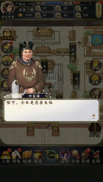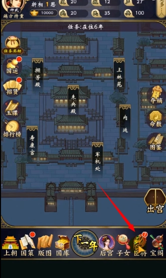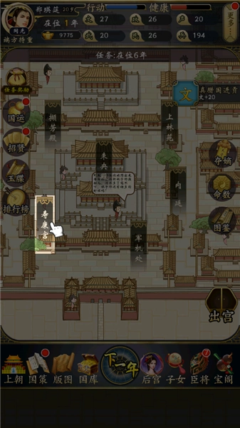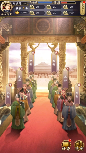 2、首先进行上朝环节,随机点击兵部、礼部等部门呈递的奏折,依据不同的选择来增加或减少声望与政务数值。